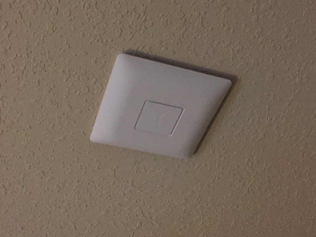 Ubiquiti UniFi UAP-AC installed on the ceiling of the main room in my house, near the center. It’s just a little bit larger than a smoke detector.