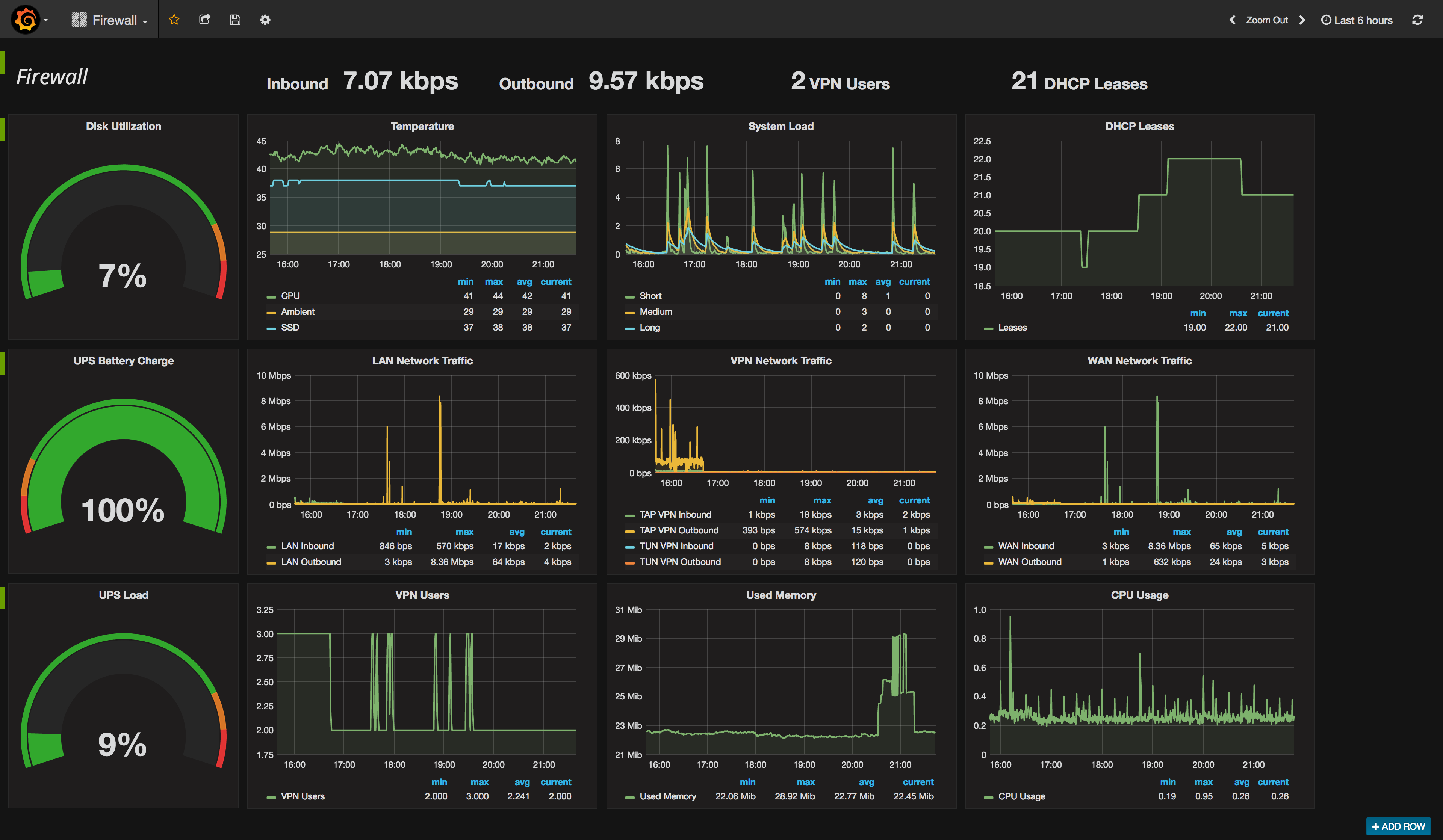 fclose(STDOUT);This combined with the data that collectd can natively collect you can assemble into a pretty neat dashboard using Grafana. Here’s one I’ve been building for the firewall.